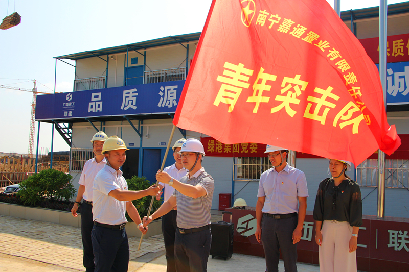 在授旗儀式中,集團黨委書記、董事長、總經(jīng)理龔國強對南寧科技產(chǎn)業(yè)園項目人員前期所做出的工作給予了充分肯定,贊揚了黨員先鋒隊員、青年突擊隊員和工人朋友們?yōu)轫椖拷ㄔO所付出的艱苦和努力,當前項目進展取得了較好的成績。自8月12日南寧科技產(chǎn)業(yè)園項目正式開工以來,嘉通公司黨支部帶領工人們?nèi)找箍喔?,千方百計克服惡劣的臺風天氣等不利因素,在短短的2個月時間便完成1#樓廠房一層的搭設模板,2#、3#樓回填基礎土方,4#樓防水保護層澆筑以及9#宿舍樓基礎承臺澆筑等工作,充分展現(xiàn)了綠港鐵軍風采。下一步,希望全體黨員先鋒隊、青年突擊隊隊員們以此次授旗為契機,繼續(xù)發(fā)揚綠港鐵軍精神,創(chuàng)先爭優(yōu),攻堅克難,加快推進項目建設,確保項目如期建成交付。