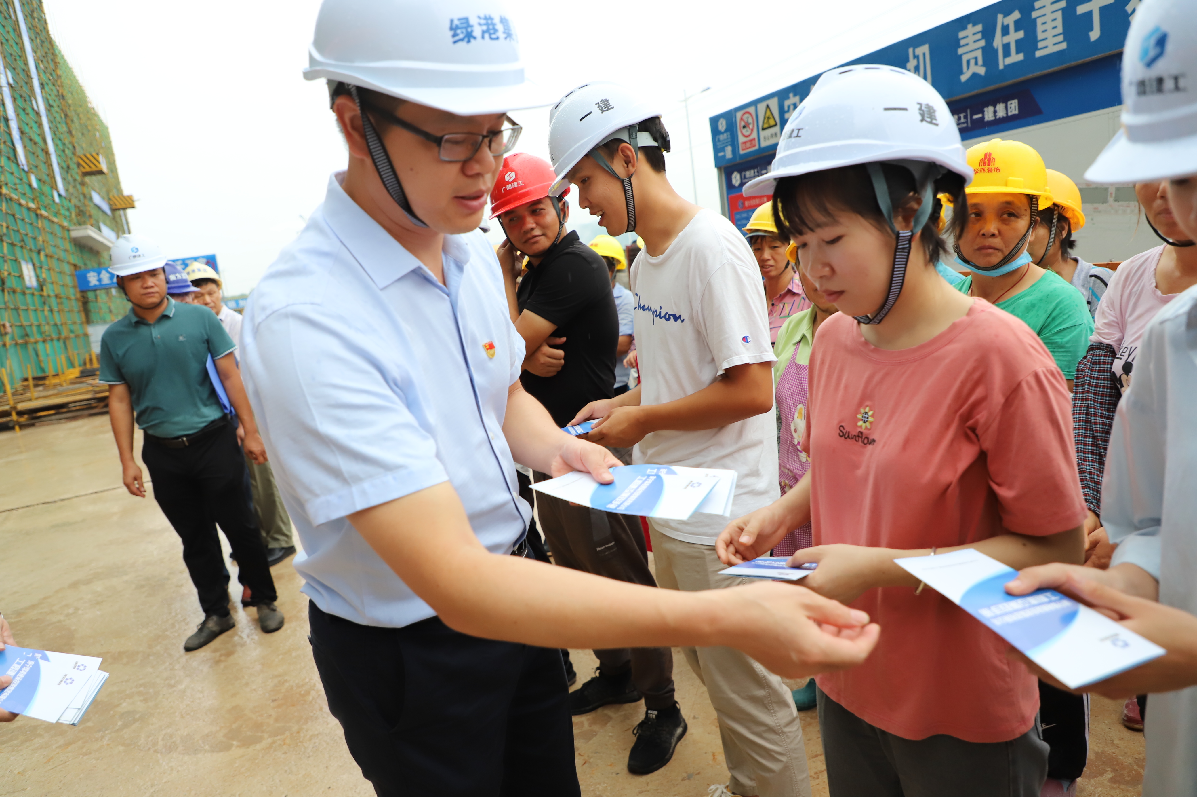 集團(tuán)黨委副書記、總經(jīng)理鄧?yán)^慧向現(xiàn)場管理人員發(fā)放《工程建設(shè)廉政手冊》