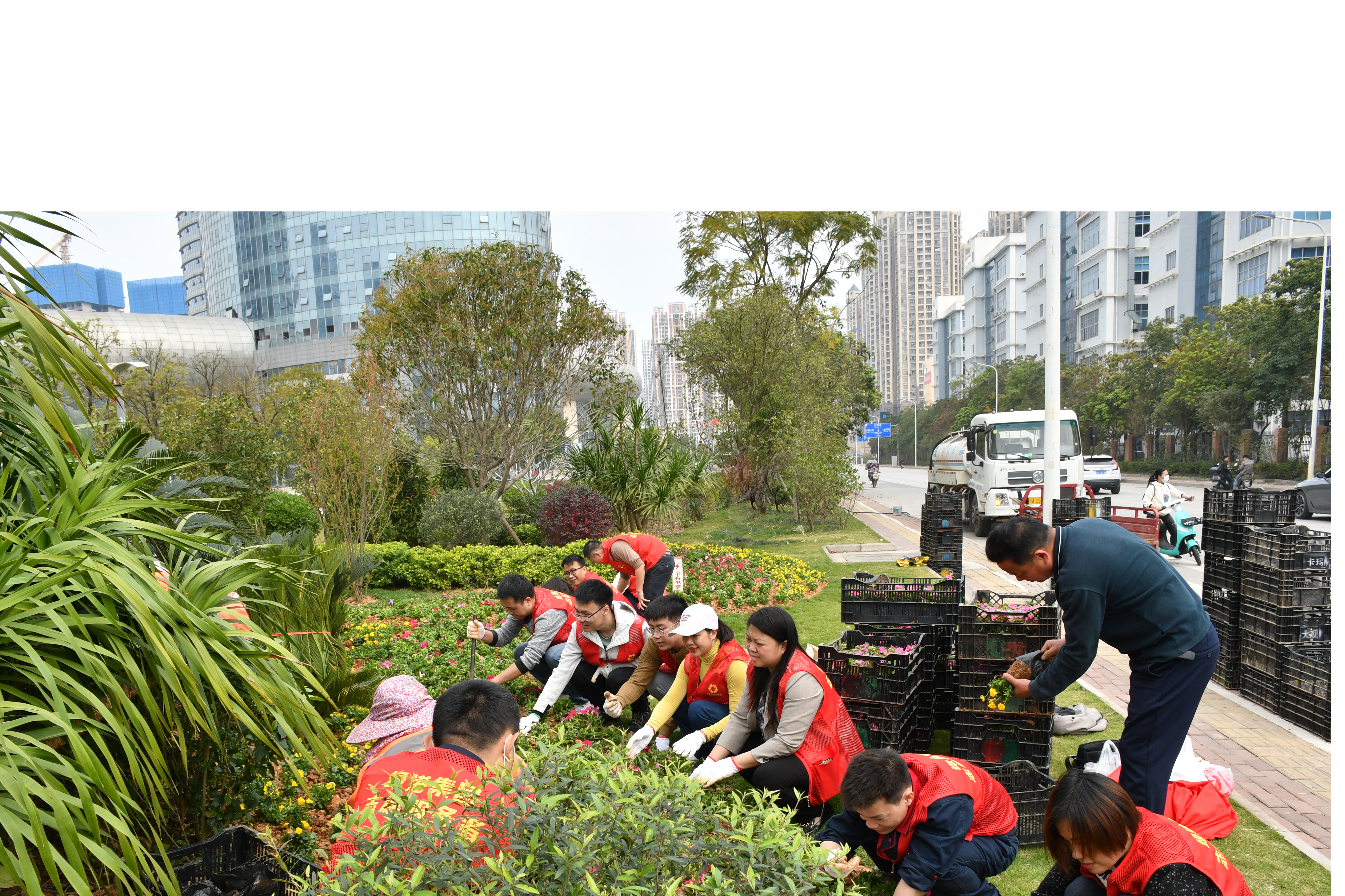 活動現(xiàn)場,志愿者們熱情高漲,在園林種植技術(shù)人員講解種植要點后,大家兩人一組,開始種植。挖坑、栽苗、培土、踩實,有序地將一顆顆綠植栽種入土,活動現(xiàn)場一片熱火朝天景象。經(jīng)過一個上午的辛勤勞作,花圃里就種滿了2000多棵綠植,連片規(guī)范的花草錯落有致、迎風(fēng)挺立,呈現(xiàn)出一派生機盎然的景象,為城市增添了一抹新綠。