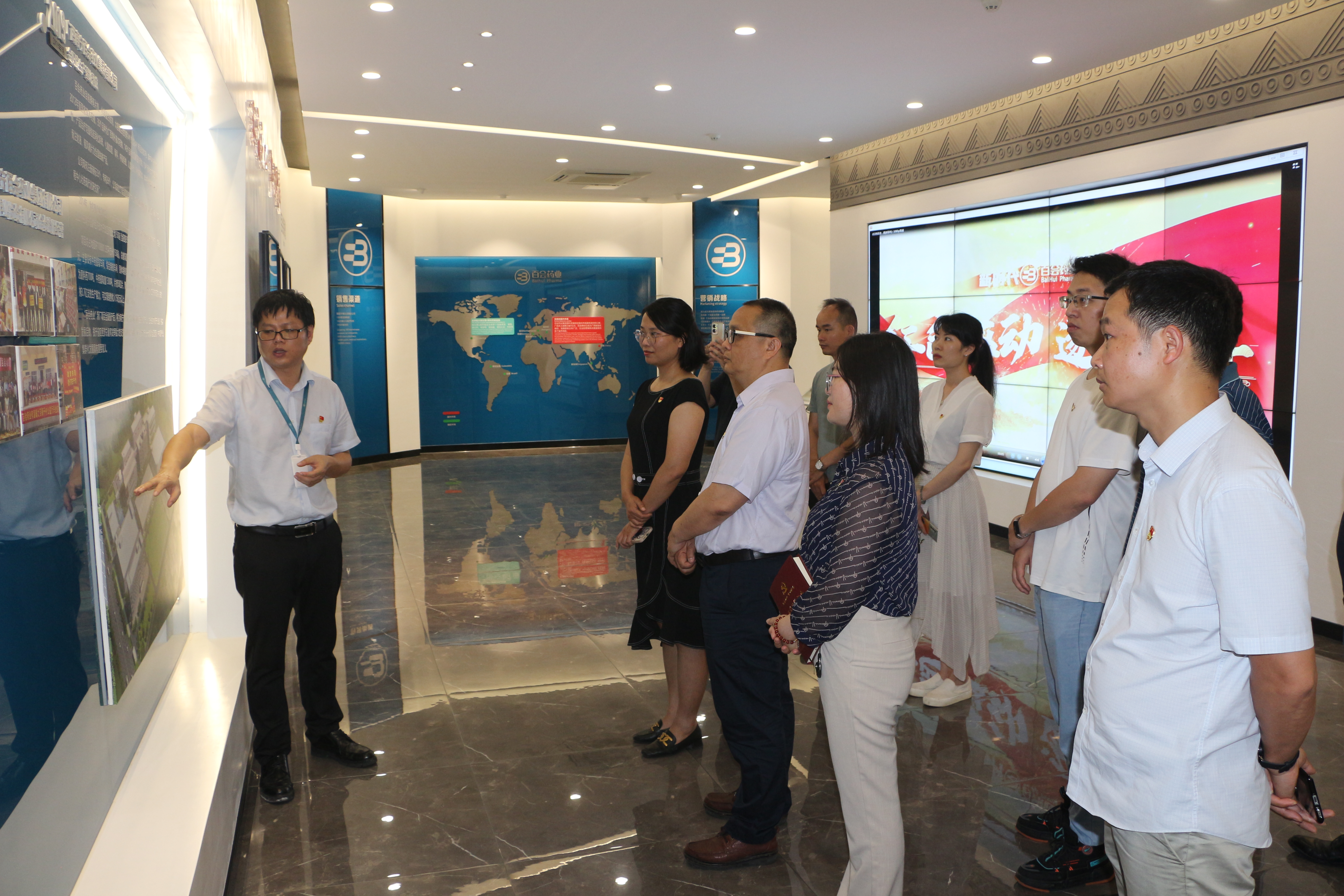 交流活動從百會藥業(yè)的展廳伊始,作為擁有八十年制藥歷史的制藥企業(yè),百會藥業(yè)黨委堅持傳承與發(fā)展,以“思想固基、聯(lián)合會診、創(chuàng)先爭優(yōu)、人才培養(yǎng)、人文關(guān)懷”五大方面做好黨建品牌創(chuàng)建工作,以黨建引領(lǐng)中醫(yī)藥傳承特別是壯藥在現(xiàn)代醫(yī)學領(lǐng)域的發(fā)展研究,傳承與發(fā)展的氣息縈繞整個展廳,參觀人員在游覽中感嘆于百會藥品技術(shù)發(fā)展與先進的制作流程。在藥品展示區(qū),雙方人員提及在支援新冠肺炎疫情防控時的擔當為民的情況,共贊以職責擔使命的行為。