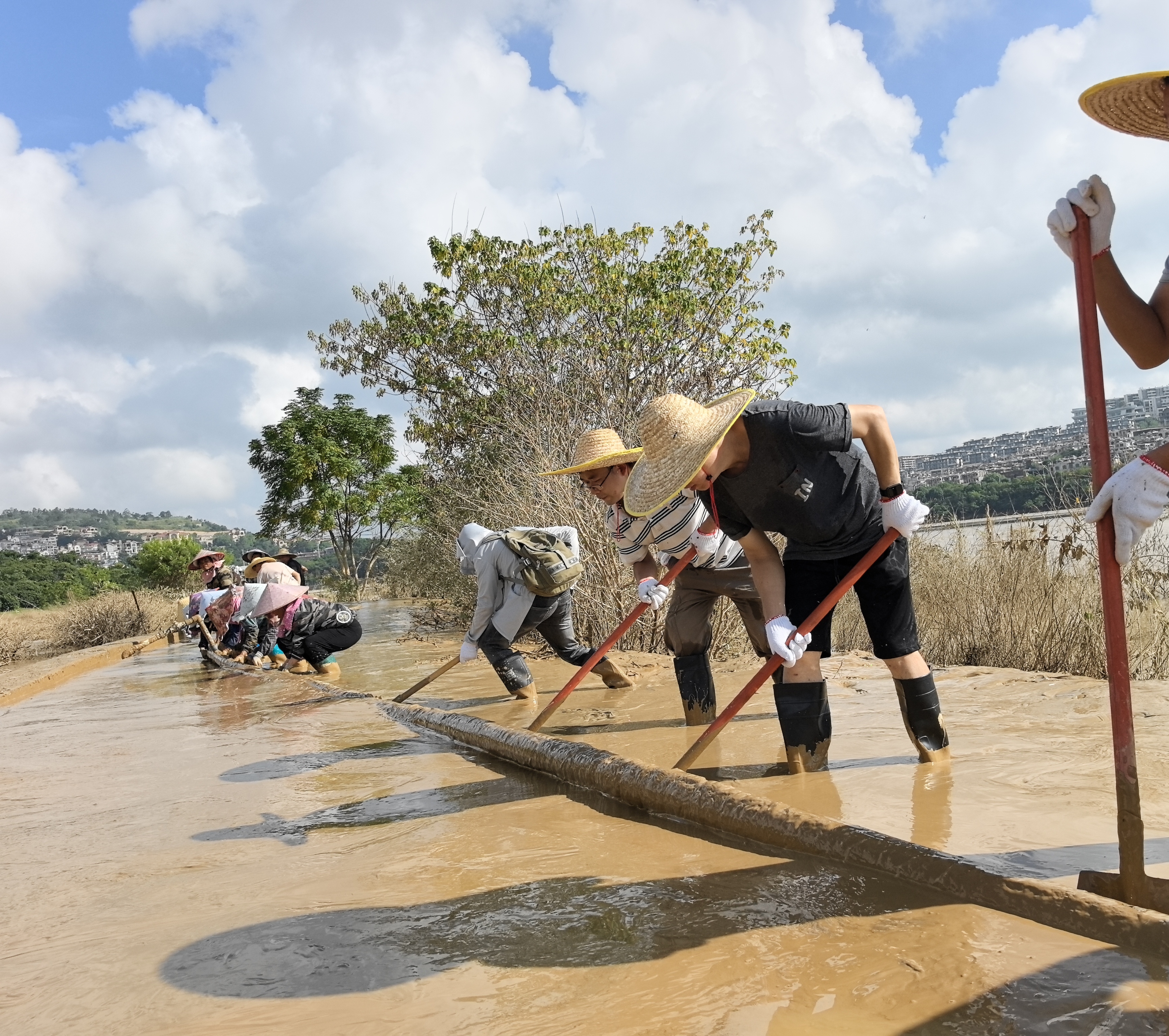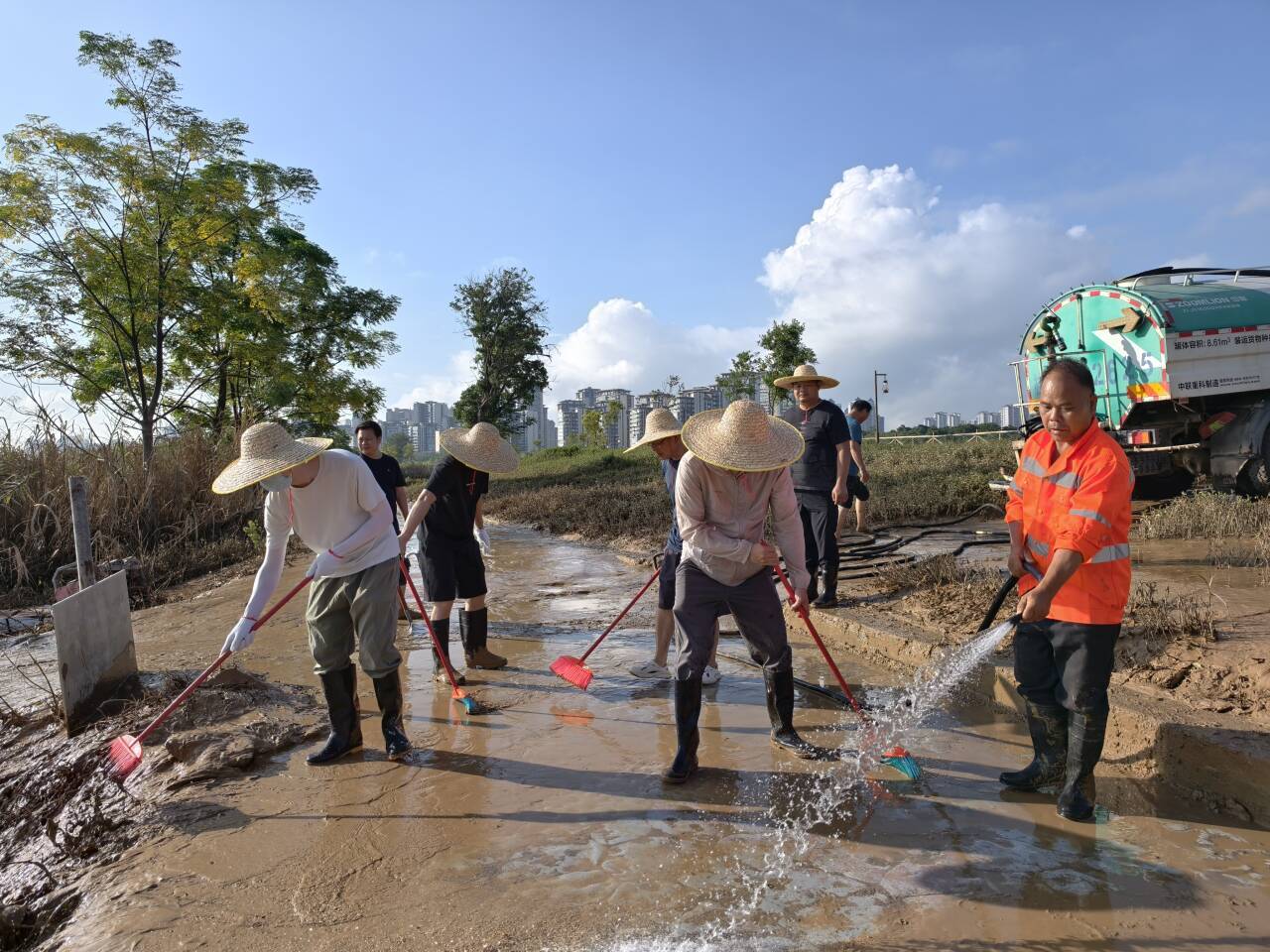 上午8點(diǎn),志愿者們攜帶鐵鏟、刮泥板、掃帚、垃圾袋等工具,準(zhǔn)時(shí)在指定區(qū)域集合?,F(xiàn)場(chǎng)的淤泥最深處達(dá)10余厘米,腳一踩便陷進(jìn)去難以拔出,鏟子剛插進(jìn)泥里就被牢牢黏住?!按蠹曳止じ桑裙伪韺幽?,再清垃圾!” 隨著一聲號(hào)召,志愿者們迅速分組行動(dòng):有的彎腰緊握刮泥板,順著步道紋理反復(fù)刮除黏連的淤泥;有的扛著水管,利用高壓水槍沖刷地面;有的拎著垃圾袋,蹲下身細(xì)致?lián)焓安卦诓菘p里的垃圾;有的則推著清運(yùn)車,來回穿梭將裝滿淤泥和垃圾的袋子及時(shí)運(yùn)離現(xiàn)場(chǎng)…… 各個(gè)環(huán)節(jié)銜接緊密、井然有序。盡管天氣炎熱,汗水順著臉頰滑落、浸透衣衫,志愿者們的熱情與干勁絲毫未減,充分展現(xiàn)了國(guó)企的責(zé)任與擔(dān)當(dāng)。